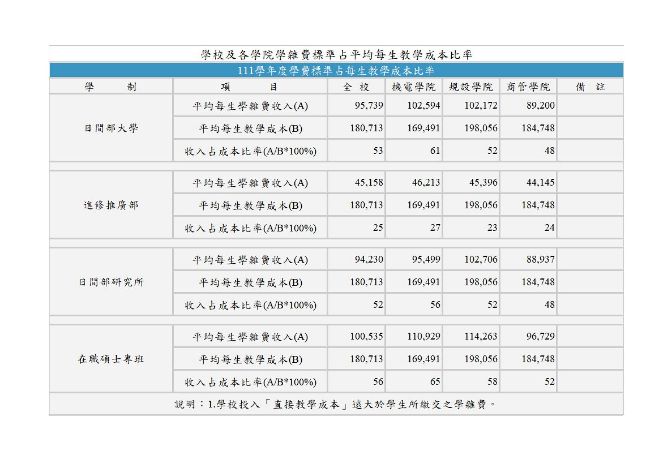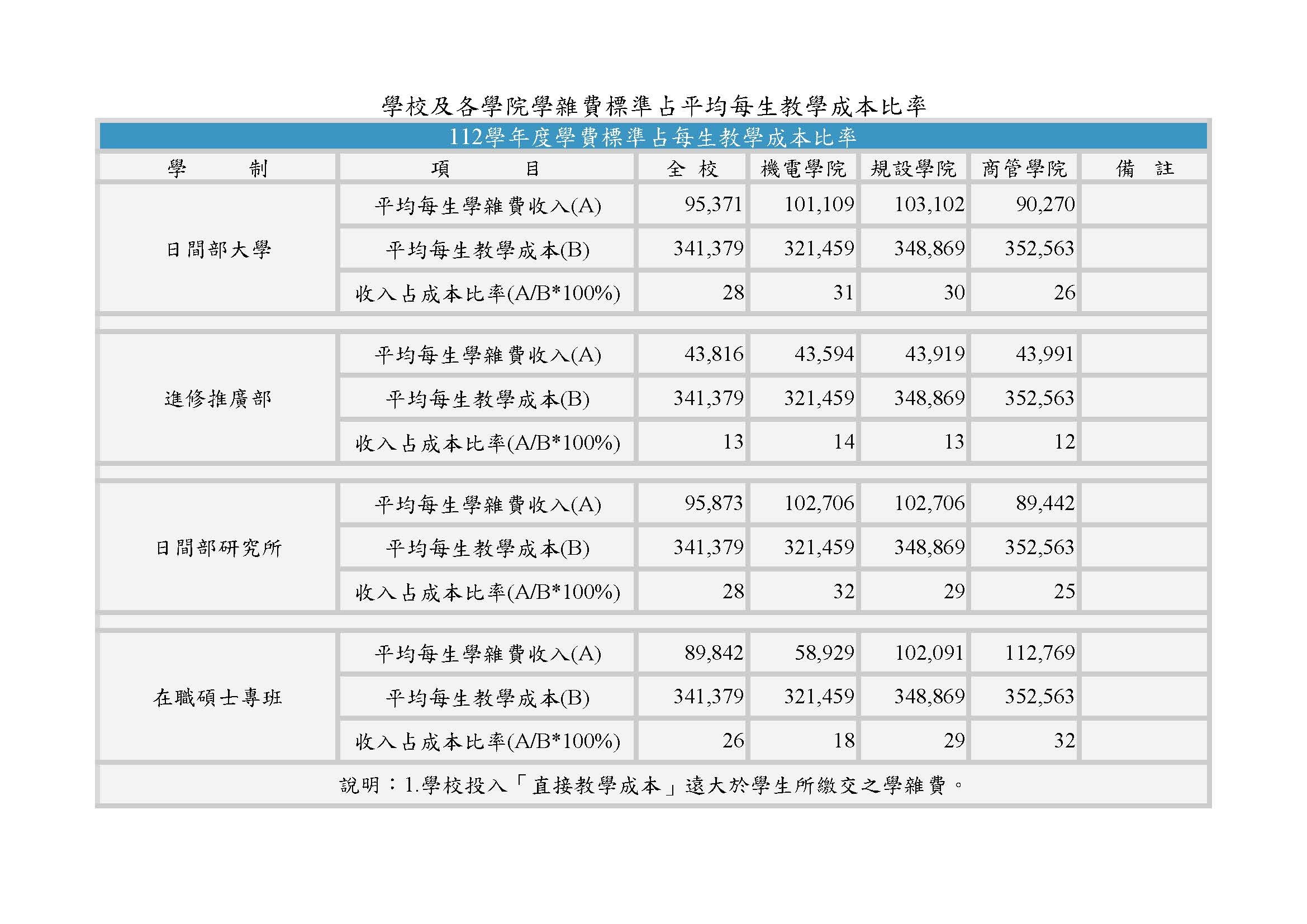 3-1-3 學校及各學院學雜費標準占平均每生教學成本比率